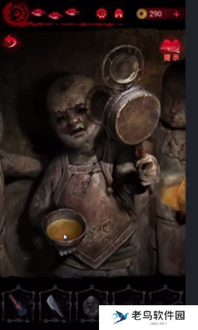 14、将手机放入墓碑上方洞孔,借石刀割断石棺上红绳可得唢呐。根据文字提示按住吹奏,完成后得纸衣服。