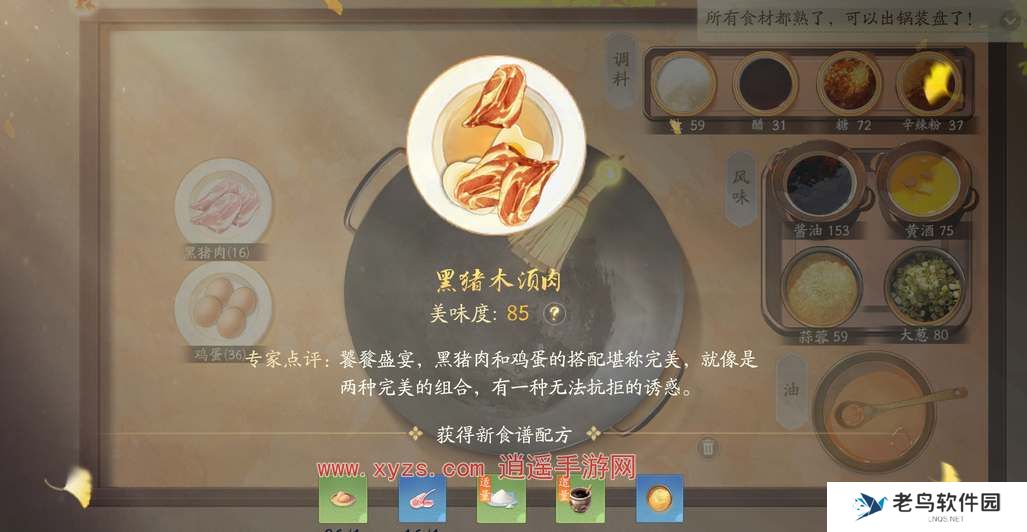 3、白鸟朝风=鸡肉+猪肉、蘑菇+适量盐、黄酒(主动技能伤害+8%6)