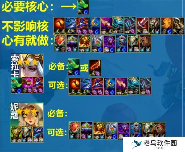 妮蔻是前排主坦,给肉装,如坚定的心、冕卫、日炎斗篷、救赎、石像鬼板甲、荆棘背心等。