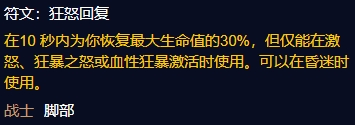 6、狂怒回复(脚):在10 秒内为你恢复最大生命值的30%,但仅能在激怒、狂暴之怒或血性狂暴激活时使用。可以在昏迷时使用。