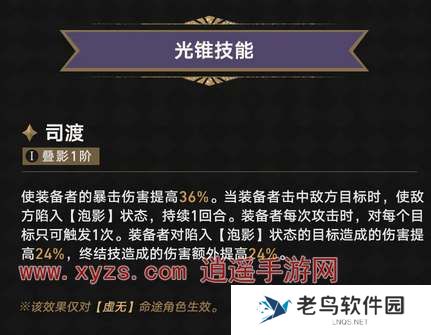 2、光锥技能:装备者的暴击伤害提高36%。当装备者击中敌方目标时,使敌方陷入【泡影】状态,持续1回合。装备者每次攻击时,对每个目标只可触发1次。装备者对陷入【泡影】状态的目标造成的伤害提高24%,终结技造成的伤害额处提高24%