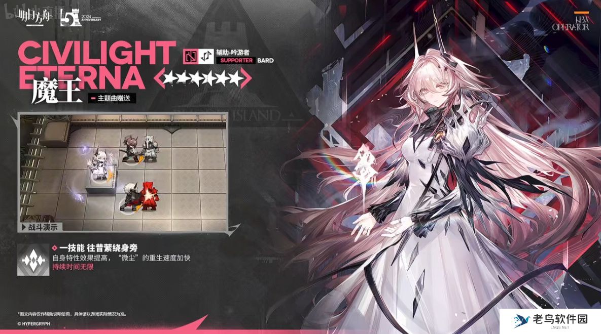 1、六星干员魔王的定位是辅助-吟游者,特性是不攻击,但持续恢复范围内所有友军生命。