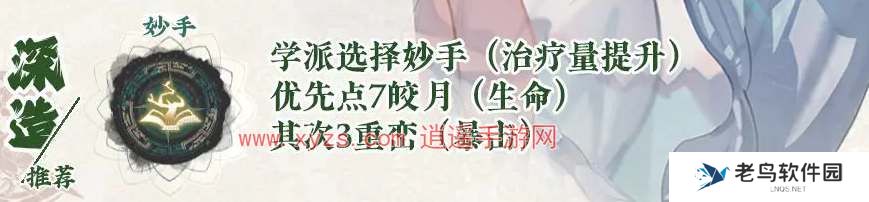深造建议选择【妙手】学派,提升治疗量,优先点7皎月提升生命,其次3重峦提升暴击。