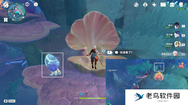 2、螺帽章鱼1:获得异色水母能力后前往下图所示的位置攻击贝壳可以开启限时挑战,需要在在40秒内打破33个胖胖果,完成后可以获得精致的宝箱。