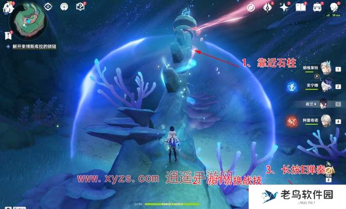 2、第一个位置在海底无水屏障内,需要玩家击败三个石像后才能解开。