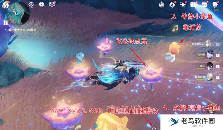 4、第三个位置在海床上,通过弹奏让金色的小章鱼靠近花之后可以将其点亮,点亮所有的花就可以完成解密。