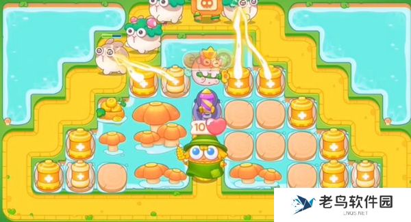 2、清理中间池塘的道具,获得更多的空位,然后继续顺着池塘的边缘放电极。确保左右沿路的兔子会一直遭受到攻击。