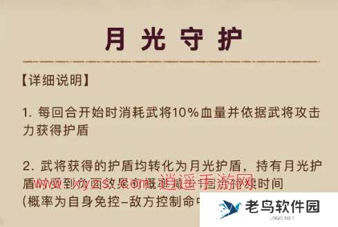 每回合消耗武将10%血量,并根据武将攻击获得护盾。
