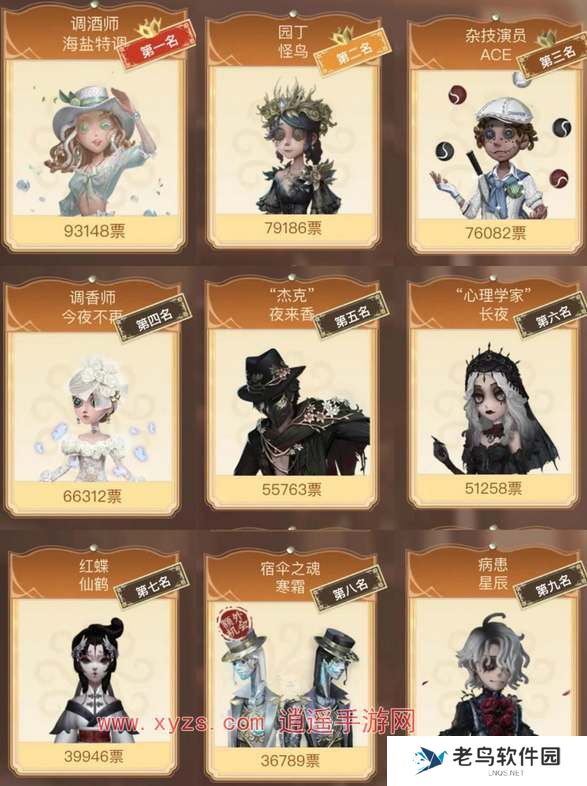 2、可以看到囚徒-冬蝉、小女孩-年岁、摄影师-月下绅士、调酒师-海盐特调、园丁-怪鸟、杂技演员-ACE这六款皮肤是在榜单排名最靠前的位置,如果能够继续保持的话最终很可能获得返场名额。