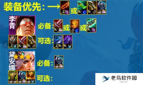 4、装备优先给盲僧合羊刀饮血剑/正义之手/科技枪、泰坦等,其次给皎月带薄暮法袍、巨人杀手、夜之锋刃等装备。