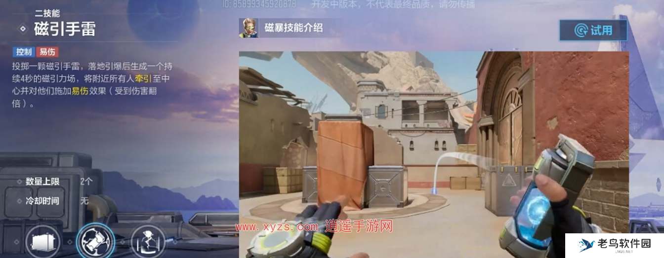 2、2技能 磁引手雷:投掷一颗手雷,落地引爆后生成一个持续4s的引力场将附近的敌人牵引到中心,并对其施加易伤效果。