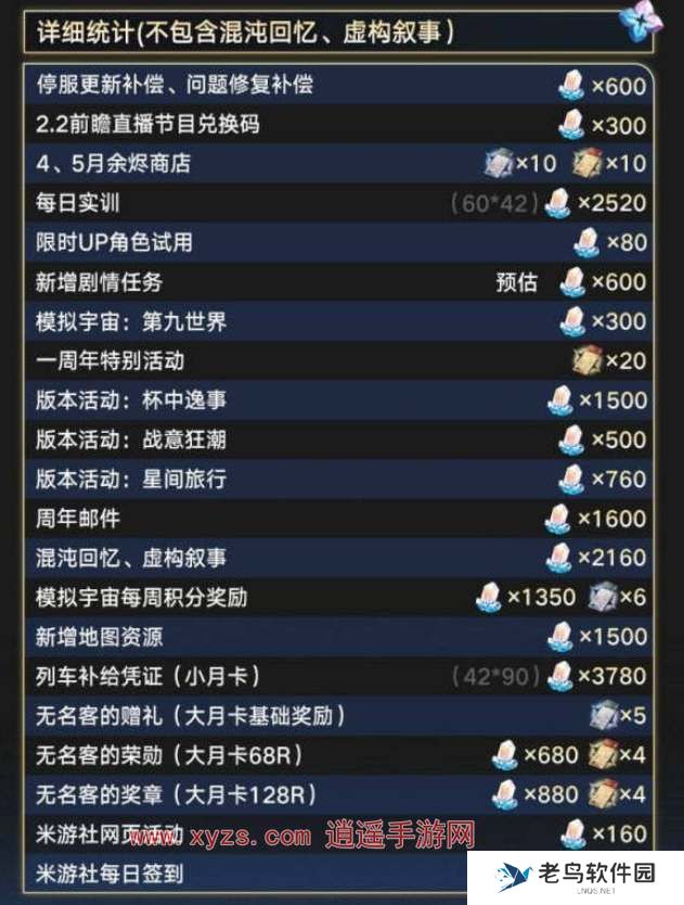 维护补偿、日常以及2.2前瞻:维护补偿600、前瞻300、每日实训2520、模拟宇宙周常奖励1350星琼。混沌回忆和虚构叙事单期全满720,三期就是2560星琼。
